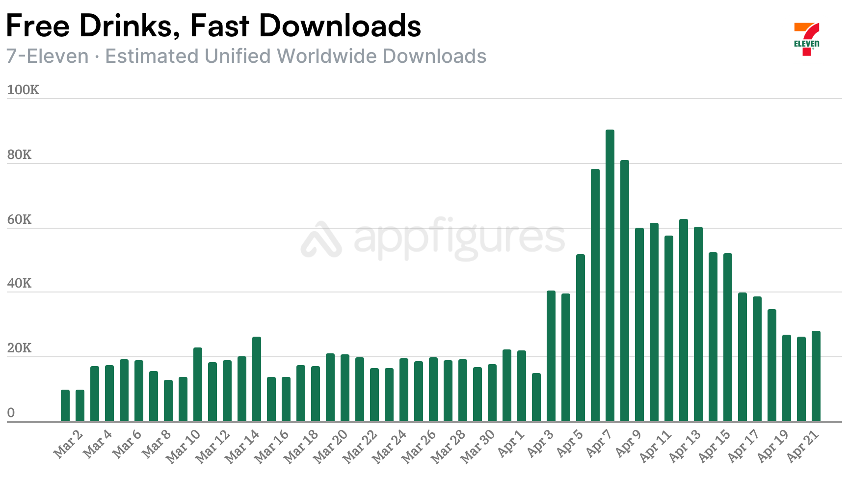 And yet, according to Appfigures Intelligence, 7-Eleven's app was downloaded an estimated 1M times between April 1 and April 21 across the App Store and Google Play. That's almost 3x the same period in March and already nearly double all of March, which ended with an estimated 548K downloads.