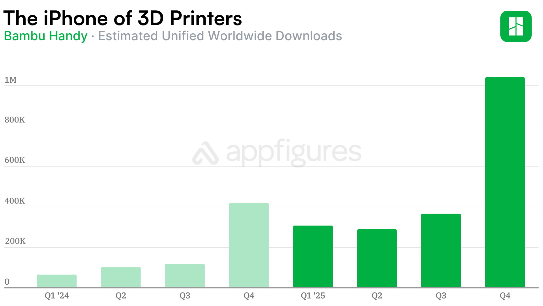 The end of 2024 was the biggest BambuLab has seen up to that point. According to Appfigures Intelligence, BambuLab's app, Bambu Handy, was downloaded 420K times between October and December. One download may not equal exactly one printer, but the number is probably close. That's a lot of 3D printers for a 3-month stretch.