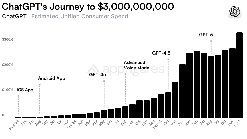 With $3 billion in cumulative revenue, ChatGPT now ranks #24 on Appfigures' all-time revenue leaderboard across both the App Store and Google Play, a remarkable feat considering most apps in that top tier have been monetizing for years longer.
