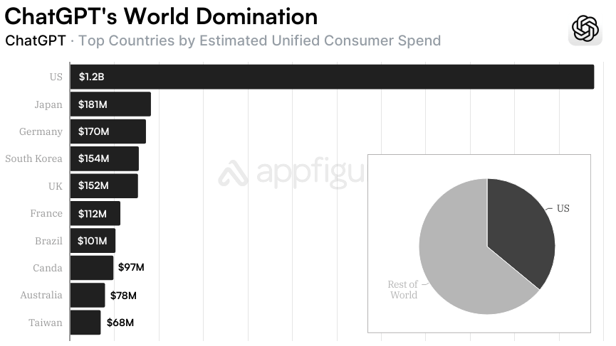 Geography tells a similar story. Based on our estimates, the US accounts for $1.2 billion of ChatGPT's revenue, more than a third of the global total. Japan comes in second at $181 million, followed by Germany ($170M), South Korea ($154M), and the UK ($152M). These aren't just wealthy markets, they're countries where professionals have integrated AI into their daily workflows.