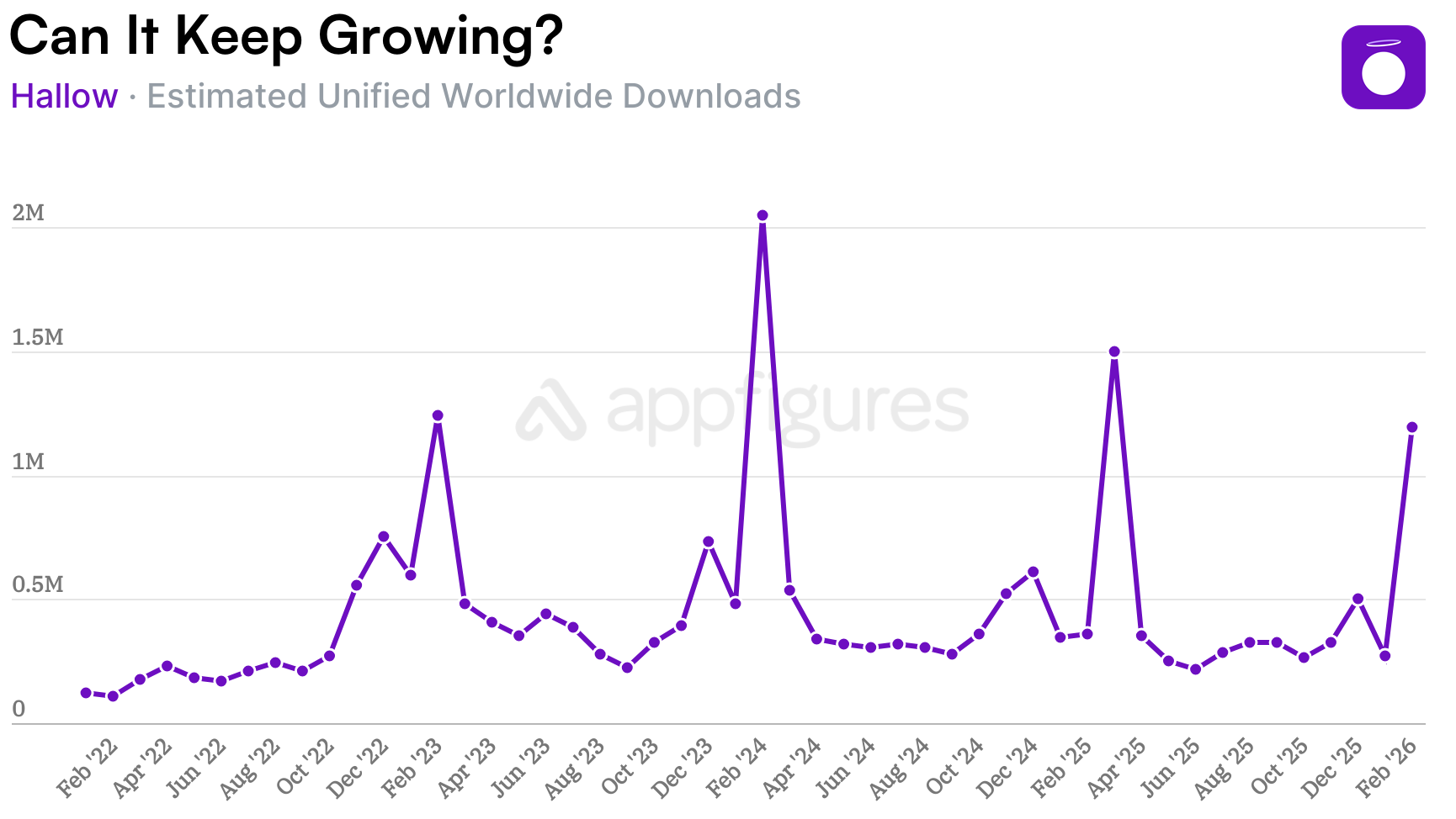 In just the first 22 days of February, Hallow racked up 1.2M downloads. For context, the app averaged about 280K downloads per month through most of 2025.