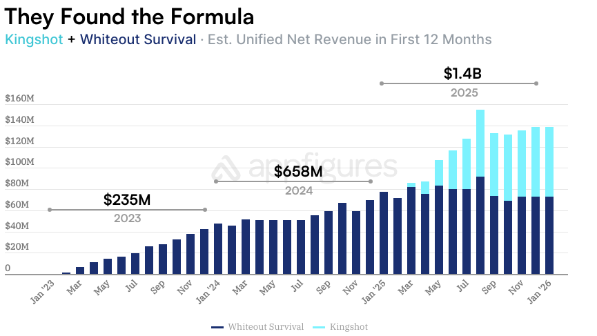 Kingshot, Century Games' follow-up, launched at the end of February 2025. According to Appfigures Intelligence, it earned over $500M in net revenue in its first 11 months on the App Store and Google Play. That's what Century Games keeps after Apple and Google take their cut. For context, Whiteout Survival took 14 months to reach that same milestone.