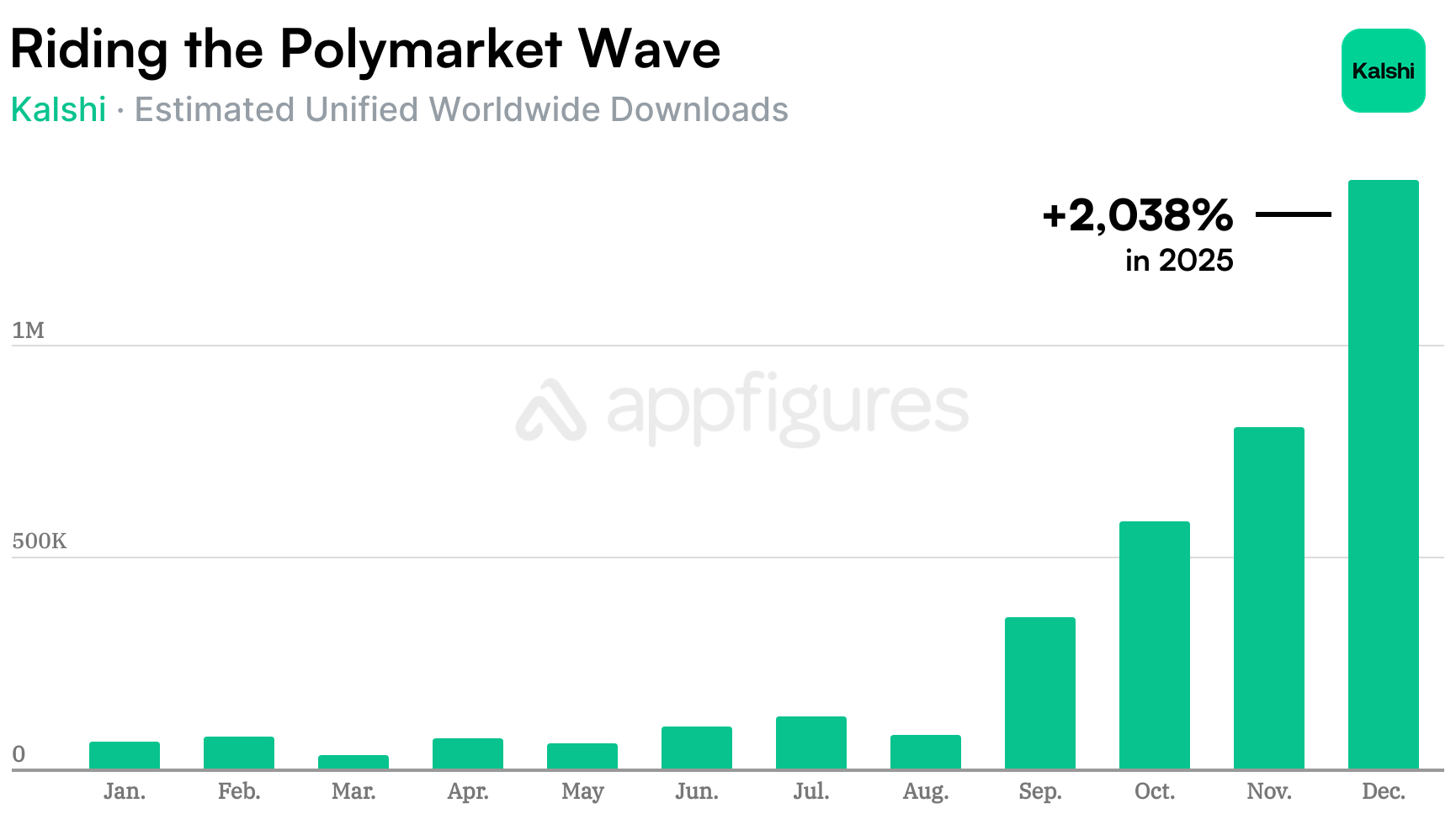 It did get more downloads, 3.7M in 2025 according to our estimates, but looking at the trend, it's clear the popularity of Polymarket is also spilling over to Kalshi, likely because it was available for US users ahead of Polymarket.