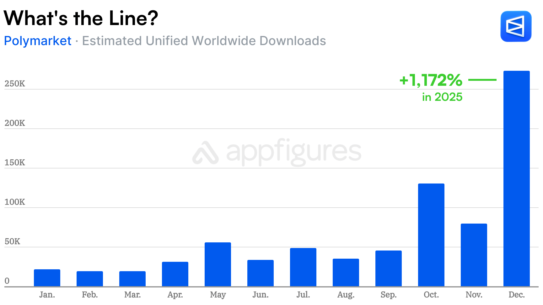 Our estimates show Polymarket was downloaded 273K times in December, up 1,172% compared to January and a total of 1.4M times since its release in October 2024. Wall Street's $2 billion bet and regulatory approval were paying off in downloads.