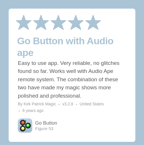 Easy to use app. Very reliable, no glitches found so far. Works well with Audio Ape remote system. The combination of these two have made my magic shows more polished and professional.