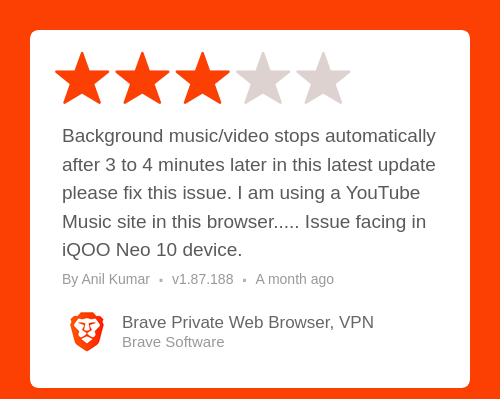 Background music/video stops automatically after 3 to 4 minutes later in this latest update please fix this issue. I am using a YouTube Music site in this browser..... Issue facing in iQOO Neo 10 device.