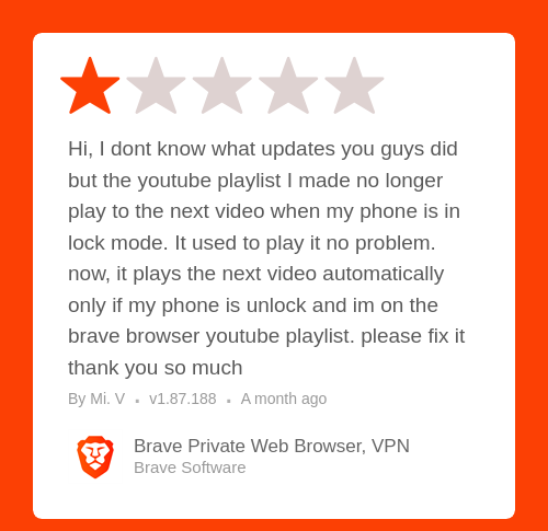 Hi, I dont know what updates you guys did but the youtube playlist I made no longer play to the next video when my phone is in lock mode. It used to play it no problem. now, it plays the next video automatically only if my phone is unlock and im on the brave browser youtube playlist. please fix it thank you so much