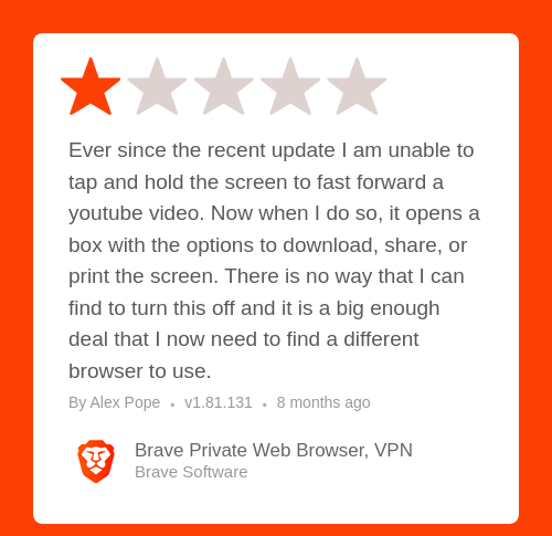 Ever since the recent update I am unable to tap and hold the screen to fast forward a youtube video. Now when I do so, it opens a box with the options to download, share, or print the screen. There is no way that I can find to turn this off and it is a big enough deal that I now need to find a different browser to use.