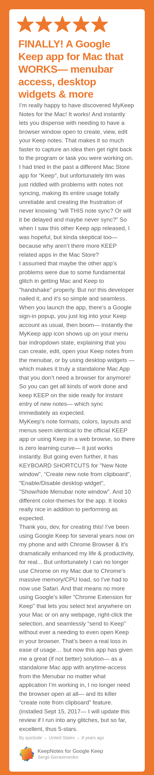 I’m really happy to have discovered MyKeep Notes for the Mac! It works! And instantly lets you dispense with needing to have a browser window open to create, view, edit your Keep notes. That makes it so much faster to capture an idea then get right back to the program or task you were working on. I had tried in the past a different Mac Store app for “Keep", but unfortunately itm was just riddled with problems with notes not syncing, making its entire usage totally unreliable and creating the frustration of never knowing “will THIS note sync? Or will it be delayed and maybe never sync?” So when I saw this other Keep app released, I was hopeful, but kinda skeptical too— because why aren’t there more KEEP related apps in the Mac Store?