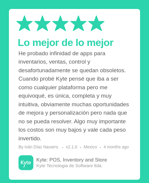 He probado infinidad de apps para inventarios, ventas, control y desafortunadamente se quedan obsoletos. Cuando probé Kyte pensé que iba a ser como cualquier plataforma pero me equivoqué, es única, completa y muy intuitiva, obviamente muchas oportunidades de mejora y personalización pero nada que no se pueda resolver. Algo muy importante los costos son muy bajos y vale cada peso invertido.