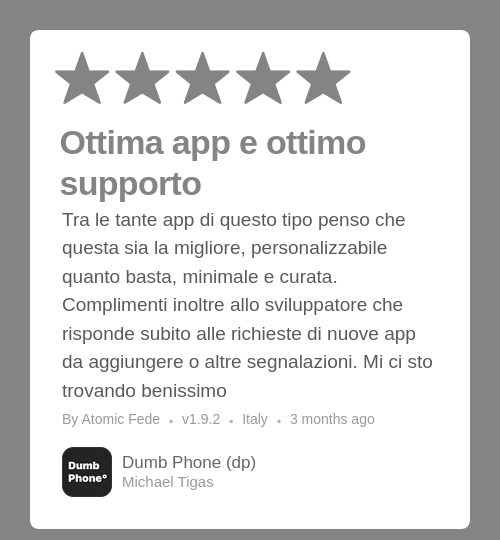 Complimenti inoltre allo sviluppatore che risponde subito alle richieste di nuove app da aggiungere o altre segnalazioni. Mi ci sto trovando benissimo