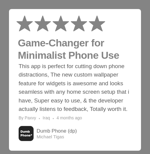 This app is perfect for cutting down phone distractions, The new custom wallpaper feature for widgets is awesome and looks seamless with any home screen setup that i have, Super easy to use, & the developer actually listens to feedback, Totally worth it.