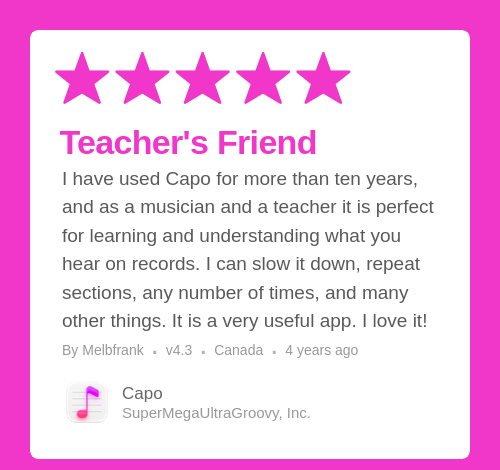 I have used Capo for more than ten years, and as a musician and a teacher it is perfect for learning and understanding what you hear on records. I can slow it down, repeat sections, any number of times, and many other things. It is a very useful app. I love it!