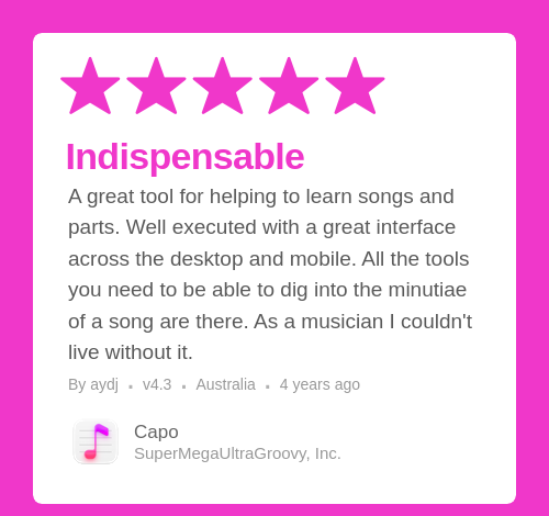 A great tool for helping to learn songs and parts. Well executed with a great interface across the desktop and mobile. All the tools you need to be able to dig into the minutiae of a song are there. As a musician I couldn't live without it.