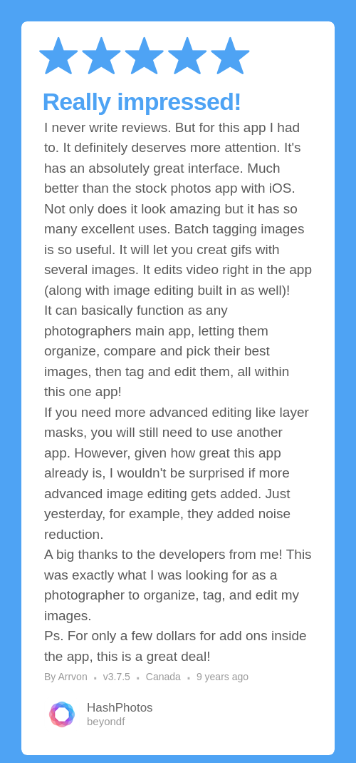 Not only does it look amazing but it has so many excellent uses. Batch tagging images is so useful. It will let you creat gifs with several images. It edits video right in the app (along with image editing built in as well)!