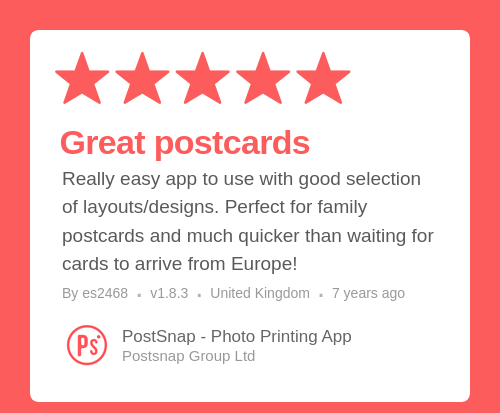 Really easy app to use with good selection of layouts/designs. Perfect for family postcards and much quicker than waiting for cards to arrive from Europe!
