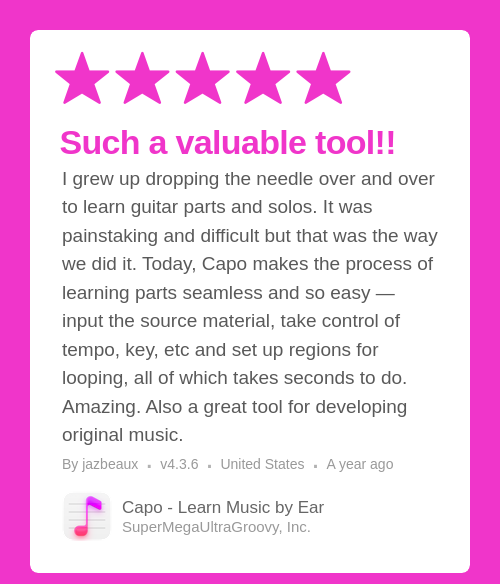 I grew up dropping the needle over and over to learn guitar parts and solos. It was painstaking and difficult but that was the way we did it. Today, Capo makes the process of learning parts seamless and so easy — input the source material, take control of tempo, key, etc and set up regions for looping, all of which takes seconds to do. Amazing. Also a great tool for developing original music.