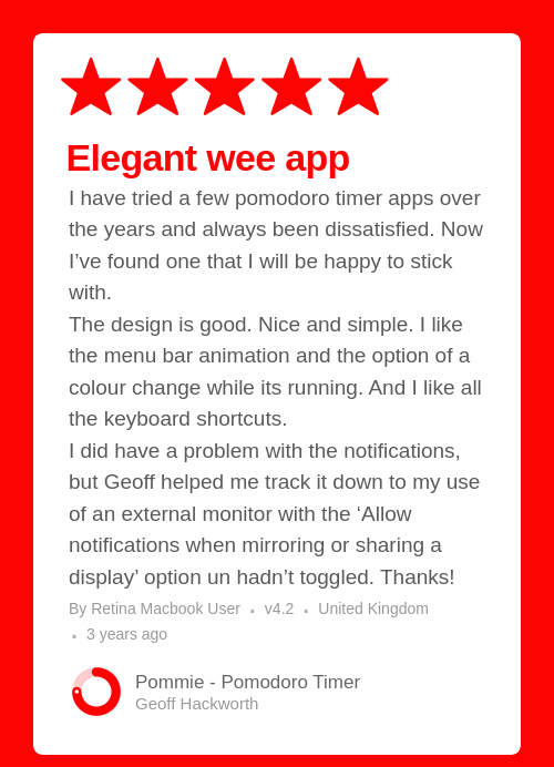 The design is good. Nice and simple. I like the menu bar animation and the option of a colour change while its running. And I like all the keyboard shortcuts.