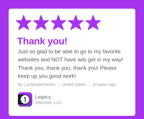 Just so glad to be able to go to my favorite websites and NOT have ads get in my way! Thank you, thank you, thank you! Please keep up you good work!