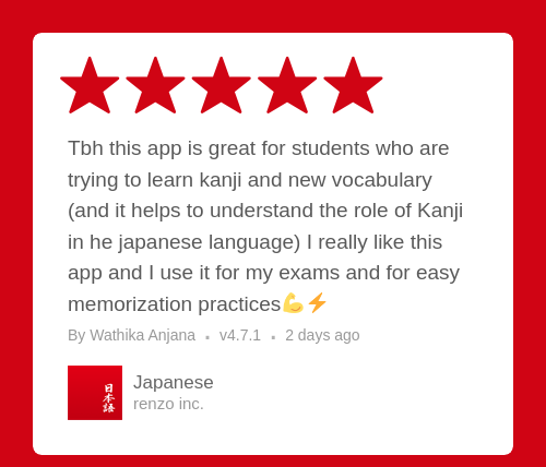 Tbh this app is great for students who are trying to learn kanji and new vocabulary (and it helps to understand the role of Kanji in he japanese language) I really like this app and I use it for my exams and for easy memorization practices