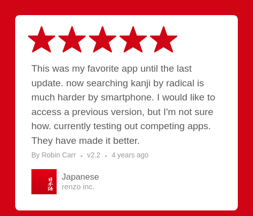 This was my favorite app until the last update. now searching kanji by radical is much harder by smartphone. I would like to access a previous version, but I'm not sure how. currently testing out competing apps. They have made it better.