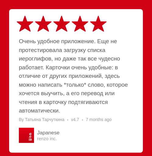 Очень удобное приложение. Еще не протестировала загрузку списка иероглифов, но даже так все чудесно работает. Карточки очень удобные: в отличие от других приложений, здесь можно написать *только* слово, которое хочется выучить, а его перевод или чтения в карточку подтягиваются автоматически.