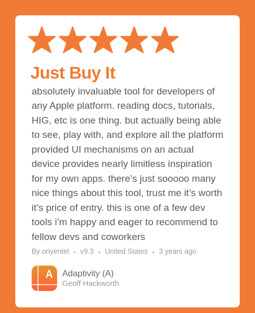 absolutely invaluable tool for developers of any Apple platform. reading docs, tutorials, HIG, etc is one thing. but actually being able to see, play with, and explore all the platform provided UI mechanisms on an actual device provides nearly limitless inspiration for my own apps. there’s just sooooo many nice things about this tool, trust me it’s worth it’s price of entry. this is one of a few dev tools i’m happy and eager to recommend to fellow devs and coworkers