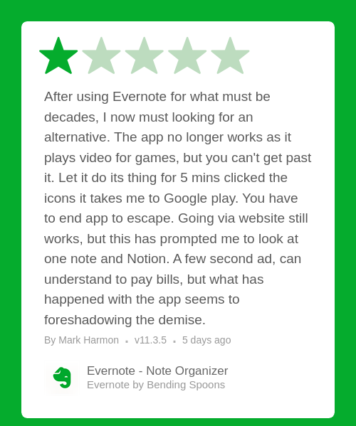 After using Evernote for what must be decades, I now must looking for an alternative. The app no longer works as it plays video for games, but you can't get past it. Let it do its thing for 5 mins clicked the icons it takes me to Google play. You have to end app to escape. Going via website still works, but this has prompted me to look at one note and Notion. A few second ad, can understand to pay bills, but what has happened with the app seems to foreshadowing the demise.