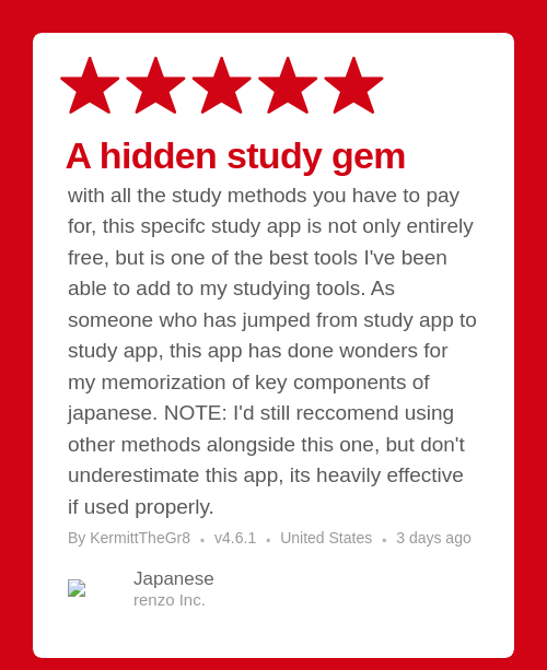 with all the study methods you have to pay for, this specifc study app is not only entirely free, but is one of the best tools I've been able to add to my studying tools. As someone who has jumped from study app to study app, this app has done wonders for my memorization of key components of japanese. NOTE: I'd still reccomend using other methods alongside this one, but don't underestimate this app, its heavily effective if used properly.