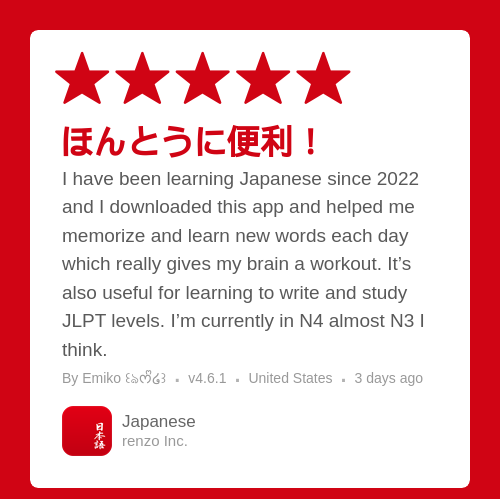 I have been learning Japanese since 2022 and I downloaded this app and helped me memorize and learn new words each day which really gives my brain a workout. It’s also useful for learning to write and study JLPT levels. I’m currently in N4 almost N3 I think.