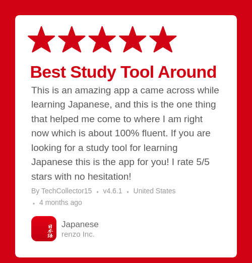 This is an amazing app a came across while learning Japanese, and this is the one thing that helped me come to where I am right now which is about 100% fluent. If you are looking for a study tool for learning Japanese this is the app for you! I rate 5/5 stars with no hesitation!