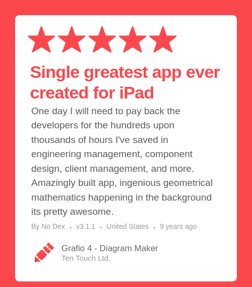 One day I will need to pay back the developers for the hundreds upon thousands of hours I've saved in engineering management, component design, client management, and more. Amazingly built app, ingenious geometrical mathematics happening in the background its pretty awesome.